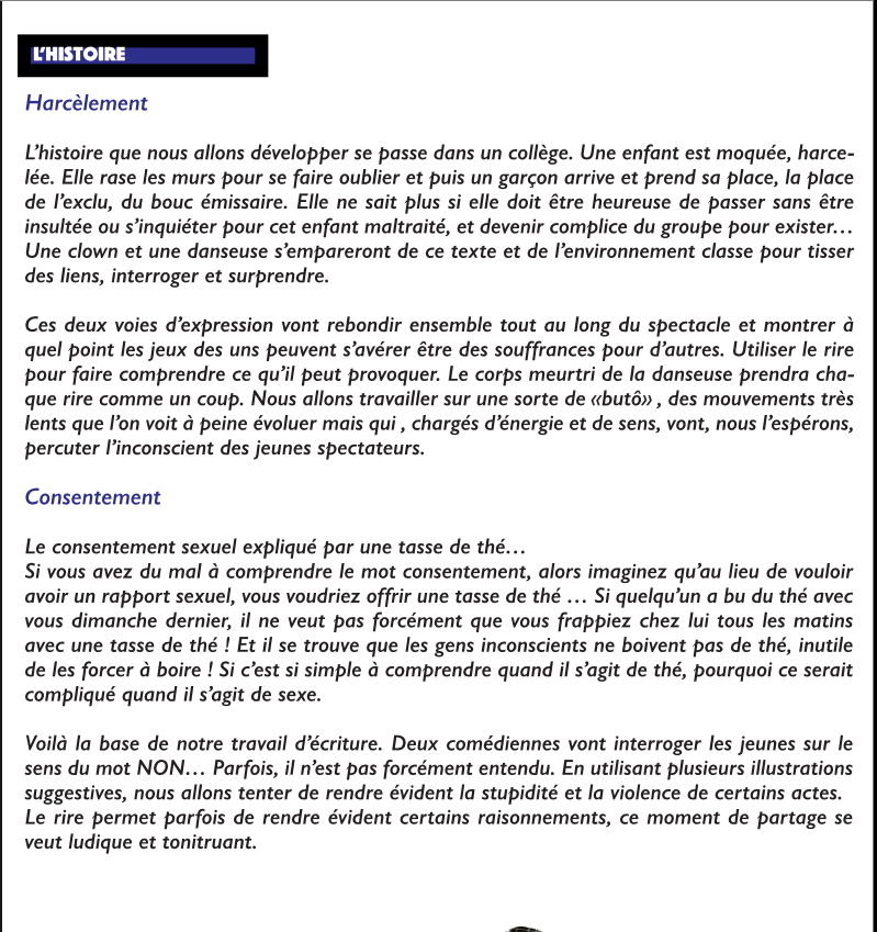 La thématique du HARCELEMENT et celle du CONSENTEMENT seront ainsi développées en parallèle ou jouées séparément ( voir le dossier complet de présentation ) .