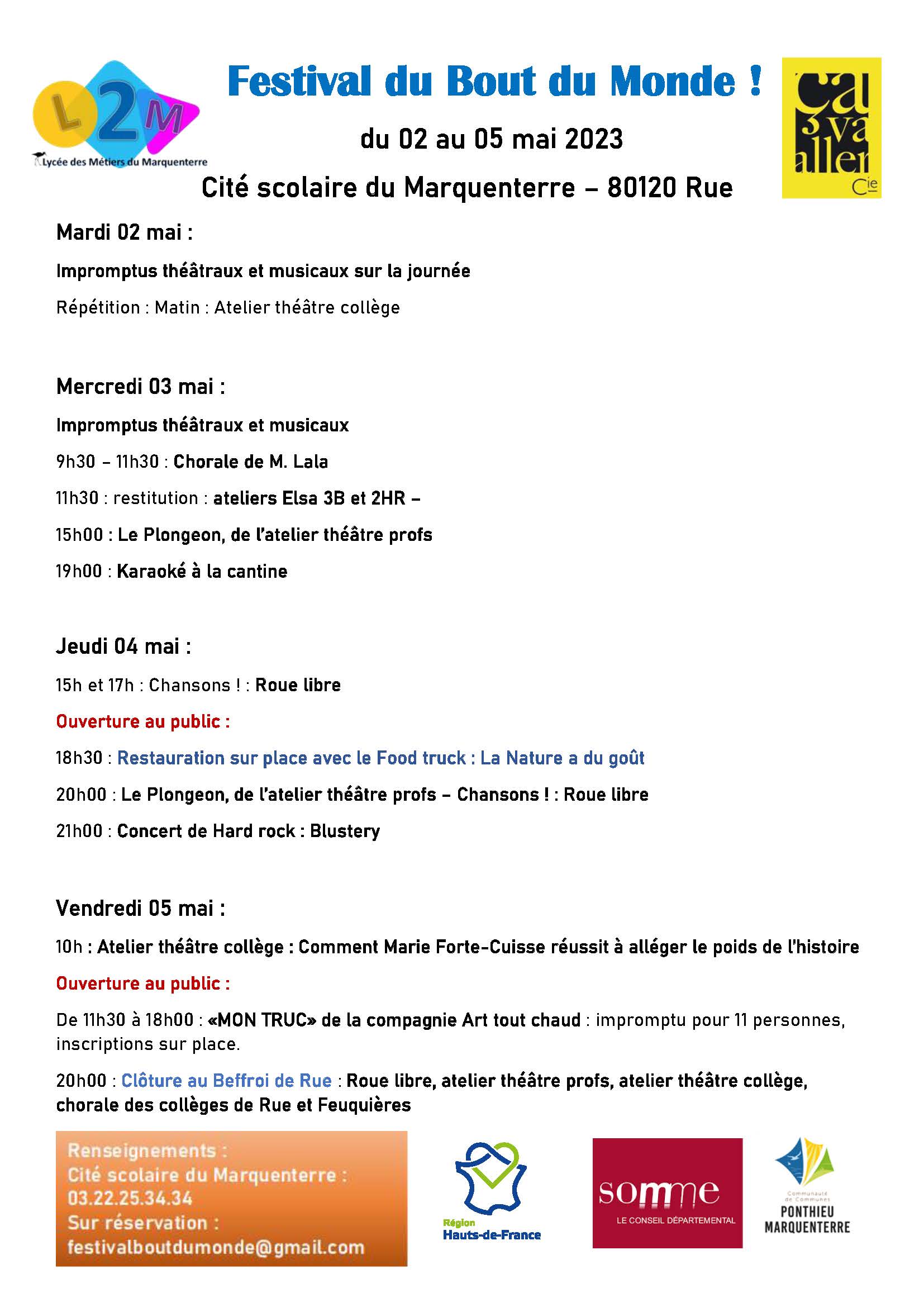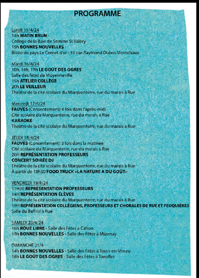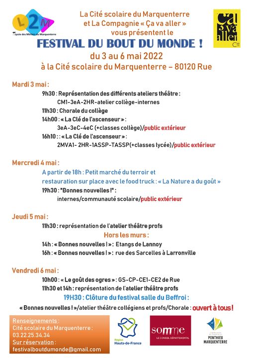 – Bonnes nouvelles du monde, le 4 mai à 19h30, Cité scolaire du Marquenterre et le 5 mai à 14h, Etang de Lannoy et 16h rue des Sarcelles à Larronville