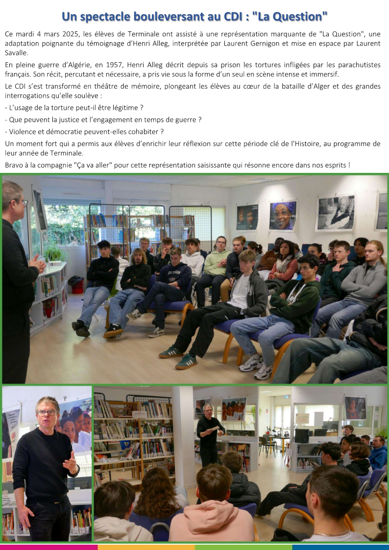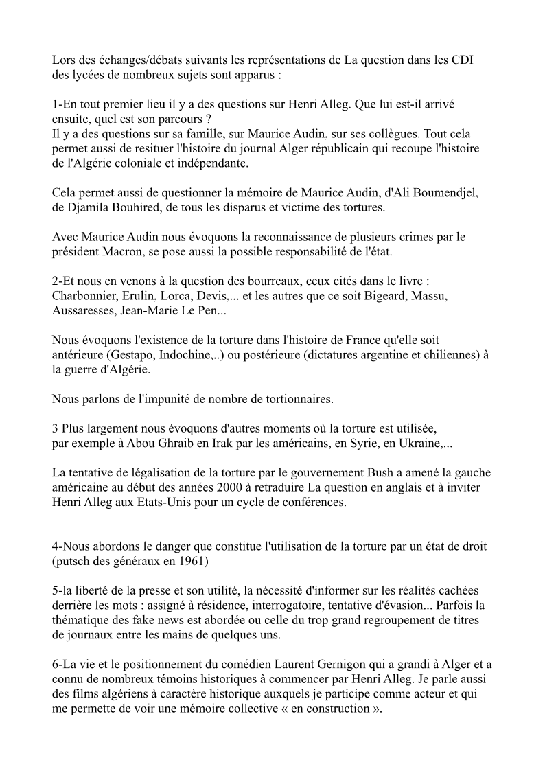 L’œuvre de HENRI ALLEG : En 1957, en pleine guerre d’Algérie, Henri Alleg, directeur du journal « Alger républicain », est arrêté à Alger et torturé par des parachutistes français dans un lieu non-officiel, le « centre de tri du sous-secteur de la Bouzaréah ».